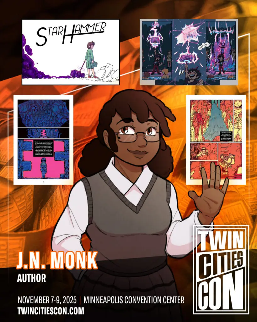 J.N. Monk is a writer from Minneapolis via Toledo, Ohio. She has written the offbeat superhero webcomic, StarHammer, a sci-fantasy Western graphic novel called Topside, and co-edited/originated the anti-imperialist space themed Enough Space for Everyone Else.